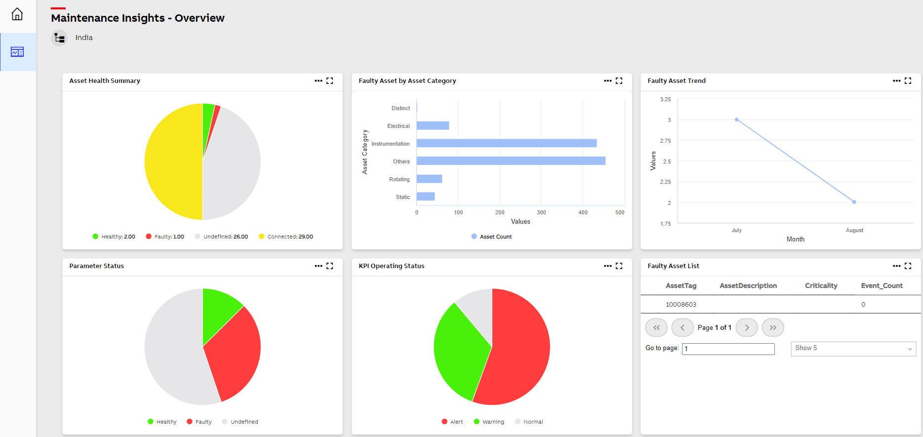 The Maintenance dashboard effectively tracks KPIs and provides actionable insights to optimize asset performance and thereby reduce operational risks. Maintenance Insights play an important role in APM by providing actionable information and data-driven insights to support maintenance decision-making.