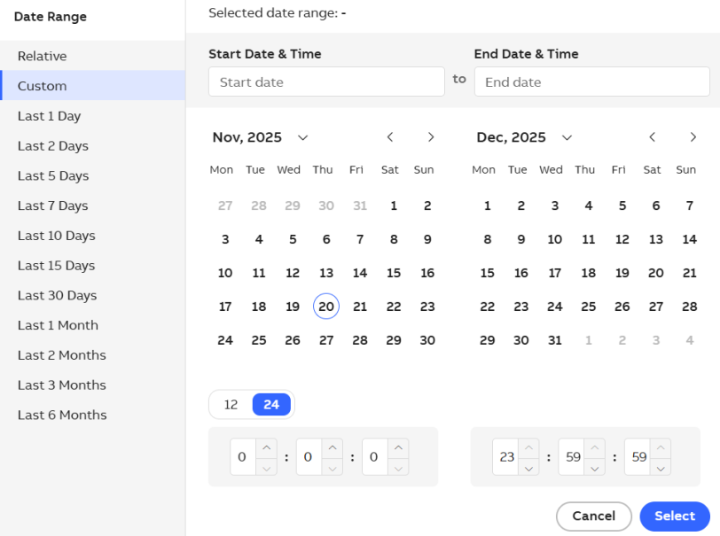 Absolute Time- The Absolute Time option lets you select a fixed time range for precise historical analysis. Use the calendar to select a date, and the From and To time fields to specify the exact start and end times.